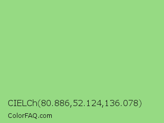 CIELCh 80.886,52.124,136.078 Color is a light green color and the nearest color is Feijoa #9fdd8c. Hex code #96da83 and RGB value is rgb(150,218,131). In RGB color space, this color is composed of 59% red, 85% green, 51% blue, In CMYK color space, this color is composed of 31% cyan, 0% magenta, 40% yellow , 15% black , In HSL color space, this color has a hue angle of 107° , 54% saturation and 68% lightness.