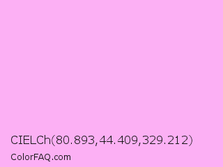 CIELCh 80.893,44.409,329.212 Color is a very light magenta color and the nearest color is Rich Brilliant Lavender #f1a7fe. Hex code #fcb0f4 and RGB value is rgb(252,176,244). In RGB color space, this color is composed of 99% red, 69% green, 96% blue, In CMYK color space, this color is composed of 0% cyan, 30% magenta, 3% yellow , 1% black , In HSL color space, this color has a hue angle of 306° , 93% saturation and 84% lightness.