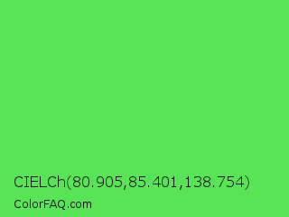CIELCh 80.905,85.401,138.754 Color is a light green color and the nearest color is Screamin Green #66ff66. Hex code #59e457 and RGB value is rgb(89,228,87). In RGB color space, this color is composed of 35% red, 89% green, 34% blue, In CMYK color space, this color is composed of 61% cyan, 0% magenta, 62% yellow , 11% black , In HSL color space, this color has a hue angle of 119° , 72% saturation and 62% lightness.