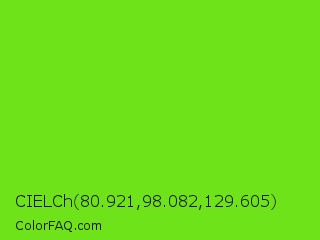 CIELCh 80.921,98.082,129.605 Color is a normal green color and the nearest color is Alien Armpit #84de02. Hex code #6ee31a and RGB value is rgb(110,227,26). In RGB color space, this color is composed of 43% red, 89% green, 10% blue, In CMYK color space, this color is composed of 52% cyan, 0% magenta, 89% yellow , 11% black , In HSL color space, this color has a hue angle of 95° , 79% saturation and 50% lightness.