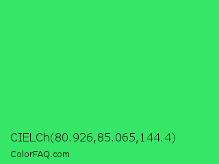 CIELCh 80.926,85.065,144.4 Color is a normal green color and the nearest color is UFO Green #3cd070. Hex code #36e666 and RGB value is rgb(54,230,102). In RGB color space, this color is composed of 21% red, 90% green, 40% blue, In CMYK color space, this color is composed of 77% cyan, 0% magenta, 56% yellow , 10% black , In HSL color space, this color has a hue angle of 136° , 78% saturation and 56% lightness.