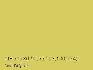 CIELCh 80.92,55.123,100.774 Color is a light yellow color and the nearest color is Tacha #d6c562. Hex code #d6cc60 and RGB value is rgb(214,204,96). In RGB color space, this color is composed of 84% red, 80% green, 38% blue, In CMYK color space, this color is composed of 0% cyan, 5% magenta, 55% yellow , 16% black , In HSL color space, this color has a hue angle of 55° , 59% saturation and 61% lightness.