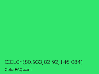CIELCh 80.933,82.92,146.084 Color is a normal green color and the nearest color is UFO Green #3cd070. Hex code #31e66d and RGB value is rgb(49,230,109). In RGB color space, this color is composed of 19% red, 90% green, 43% blue, In CMYK color space, this color is composed of 79% cyan, 0% magenta, 53% yellow , 10% black , In HSL color space, this color has a hue angle of 140° , 78% saturation and 55% lightness.