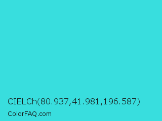 CIELCh 80.937,41.981,196.587 Color is a normal cyan color and the nearest color is Turquoise #40e0d0. Hex code #38dede and RGB value is rgb(56,222,222). In RGB color space, this color is composed of 22% red, 87% green, 87% blue, In CMYK color space, this color is composed of 75% cyan, 0% magenta, 0% yellow , 13% black , In HSL color space, this color has a hue angle of 180° , 72% saturation and 55% lightness.