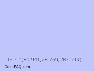 CIELCh 80.941,28.769,287.549 Color is a very light blue color and the nearest color is Melrose #c7c1ff. Hex code #bec6fc and RGB value is rgb(190,198,252). In RGB color space, this color is composed of 75% red, 78% green, 99% blue, In CMYK color space, this color is composed of 25% cyan, 21% magenta, 0% yellow , 1% black , In HSL color space, this color has a hue angle of 232° , 91% saturation and 87% lightness.