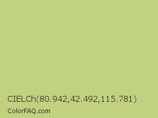 CIELCh 80.942,42.492,115.781 Color is a light lime color and the nearest color is Medium Spring Bud #c9dc87. Hex code #c0d180 and RGB value is rgb(192,209,128). In RGB color space, this color is composed of 75% red, 82% green, 50% blue, In CMYK color space, this color is composed of 8% cyan, 0% magenta, 39% yellow , 18% black , In HSL color space, this color has a hue angle of 73° , 47% saturation and 66% lightness.