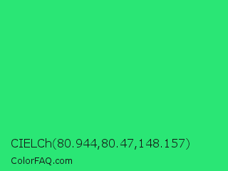 CIELCh 80.944,80.47,148.157 Color is a normal green color and the nearest color is UFO Green #3cd070. Hex code #2ae675 and RGB value is rgb(42,230,117). In RGB color space, this color is composed of 16% red, 90% green, 46% blue, In CMYK color space, this color is composed of 82% cyan, 0% magenta, 49% yellow , 10% black , In HSL color space, this color has a hue angle of 144° , 79% saturation and 53% lightness.