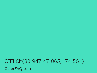 CIELCh 80.947,47.865,174.561 Color is a normal cyan color and the nearest color is Turquoise #40e0d0. Hex code #46e0bf and RGB value is rgb(70,224,191). In RGB color space, this color is composed of 27% red, 88% green, 75% blue, In CMYK color space, this color is composed of 69% cyan, 0% magenta, 15% yellow , 12% black , In HSL color space, this color has a hue angle of 167° , 71% saturation and 58% lightness.
