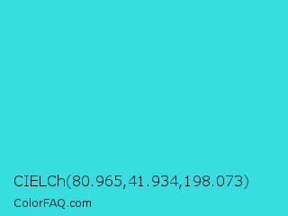 CIELCh 80.965,41.934,198.073 Color is a normal cyan color and the nearest color is Turquoise #40e0d0. Hex code #36dee0 and RGB value is rgb(54,222,224). In RGB color space, this color is composed of 21% red, 87% green, 88% blue, In CMYK color space, this color is composed of 76% cyan, 1% magenta, 0% yellow , 12% black , In HSL color space, this color has a hue angle of 181° , 73% saturation and 55% lightness.