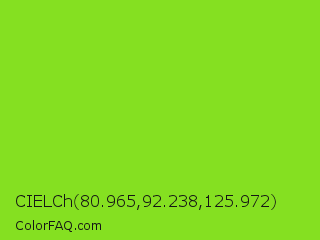 CIELCh 80.965,92.238,125.972 Color is a normal green color and the nearest color is Atlantis #97cd2d. Hex code #85e021 and RGB value is rgb(133,224,33). In RGB color space, this color is composed of 52% red, 88% green, 13% blue, In CMYK color space, this color is composed of 41% cyan, 0% magenta, 85% yellow , 12% black , In HSL color space, this color has a hue angle of 89° , 75% saturation and 50% lightness.