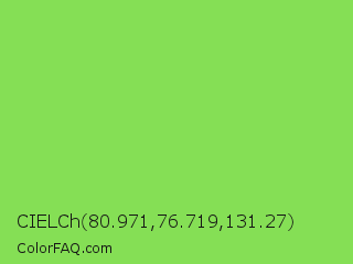 CIELCh 80.971,76.719,131.27 Color is a normal green color and the nearest color is Kiwi #8ee53f. Hex code #85df55 and RGB value is rgb(133,223,85). In RGB color space, this color is composed of 52% red, 87% green, 33% blue, In CMYK color space, this color is composed of 40% cyan, 0% magenta, 62% yellow , 13% black , In HSL color space, this color has a hue angle of 99° , 68% saturation and 60% lightness.