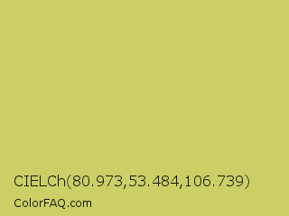 CIELCh 80.973,53.484,106.739 Color is a light yellow color and the nearest color is Tacha #d6c562. Hex code #cccf66 and RGB value is rgb(204,207,102). In RGB color space, this color is composed of 80% red, 81% green, 40% blue, In CMYK color space, this color is composed of 1% cyan, 0% magenta, 51% yellow , 19% black , In HSL color space, this color has a hue angle of 62° , 52% saturation and 61% lightness.