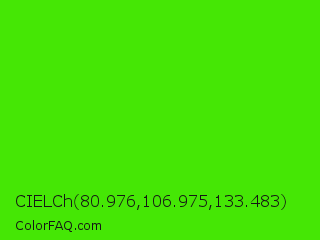 CIELCh 80.976,106.975,133.483 Color is a normal green color and the nearest color is Chlorophyll Green #4aff00. Hex code #45e705 and RGB value is rgb(69,231,5). In RGB color space, this color is composed of 27% red, 91% green, 2% blue, In CMYK color space, this color is composed of 70% cyan, 0% magenta, 98% yellow , 9% black , In HSL color space, this color has a hue angle of 103° , 96% saturation and 46% lightness.