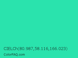 CIELCh 80.987,58.116,166.023 Color is a normal green color and the nearest color is Eucalyptus #44d7a8. Hex code #2ae3ad and RGB value is rgb(42,227,173). In RGB color space, this color is composed of 16% red, 89% green, 68% blue, In CMYK color space, this color is composed of 81% cyan, 0% magenta, 24% yellow , 11% black , In HSL color space, this color has a hue angle of 162° , 77% saturation and 53% lightness.