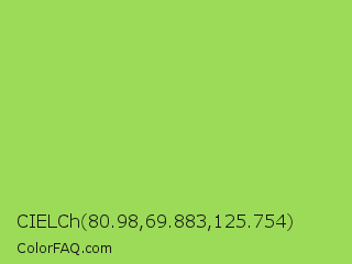 CIELCh 80.98,69.883,125.754 Color is a normal green color and the nearest color is Conifer #acdd4d. Hex code #9cdb58 and RGB value is rgb(156,219,88). In RGB color space, this color is composed of 61% red, 86% green, 35% blue, In CMYK color space, this color is composed of 29% cyan, 0% magenta, 60% yellow , 14% black , In HSL color space, this color has a hue angle of 89° , 65% saturation and 60% lightness.