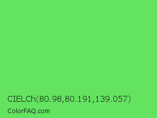 CIELCh 80.98,80.191,139.057 Color is a light green color and the nearest color is Screamin Green #66ff66. Hex code #63e360 and RGB value is rgb(99,227,96). In RGB color space, this color is composed of 39% red, 89% green, 38% blue, In CMYK color space, this color is composed of 56% cyan, 0% magenta, 58% yellow , 11% black , In HSL color space, this color has a hue angle of 119° , 70% saturation and 63% lightness.