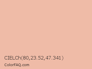 CIELCh 80,23.52,47.341 Color is a light orange color and the nearest color is Cashmere #e6bea5. Hex code #efbba7 and RGB value is rgb(239,187,167). In RGB color space, this color is composed of 94% red, 73% green, 65% blue, In CMYK color space, this color is composed of 0% cyan, 22% magenta, 30% yellow , 6% black , In HSL color space, this color has a hue angle of 17° , 69% saturation and 80% lightness.