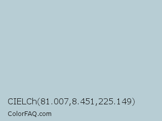 CIELCh 81.007,8.451,225.149 Color is a light blue color and the nearest color is Jungle Mist #b4cfd3. Hex code #b7cdd4 and RGB value is rgb(183,205,212). In RGB color space, this color is composed of 72% red, 80% green, 83% blue, In CMYK color space, this color is composed of 14% cyan, 3% magenta, 0% yellow , 17% black , In HSL color space, this color has a hue angle of 194° , 25% saturation and 77% lightness.