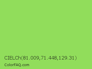 CIELCh 81.009,71.448,129.31 Color is a light green color and the nearest color is Kiwi #8ee53f. Hex code #91dd5b and RGB value is rgb(145,221,91). In RGB color space, this color is composed of 57% red, 87% green, 36% blue, In CMYK color space, this color is composed of 34% cyan, 0% magenta, 59% yellow , 13% black , In HSL color space, this color has a hue angle of 95° , 66% saturation and 61% lightness.