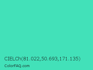 CIELCh 81.022,50.693,171.135 Color is a normal cyan color and the nearest color is Eucalyptus #44d7a8. Hex code #42e1b9 and RGB value is rgb(66,225,185). In RGB color space, this color is composed of 26% red, 88% green, 73% blue, In CMYK color space, this color is composed of 71% cyan, 0% magenta, 18% yellow , 12% black , In HSL color space, this color has a hue angle of 165° , 73% saturation and 57% lightness.
