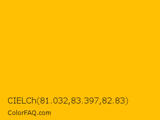 CIELCh 81.032,83.397,82.83 Color is a normal orange color and the nearest color is Amber #ffbf00. Hex code #ffbf03 and RGB value is rgb(255,191,3). In RGB color space, this color is composed of 100% red, 75% green, 1% blue, In CMYK color space, this color is composed of 0% cyan, 25% magenta, 99% yellow , 0% black , In HSL color space, this color has a hue angle of 45° , 100% saturation and 51% lightness.