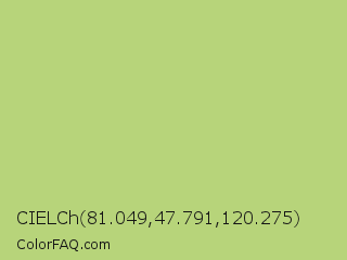 CIELCh 81.049,47.791,120.275 Color is a light lime color and the nearest color is Yellow Green #c5e17a. Hex code #b7d47a and RGB value is rgb(183,212,122). In RGB color space, this color is composed of 72% red, 83% green, 48% blue, In CMYK color space, this color is composed of 14% cyan, 0% magenta, 42% yellow , 17% black , In HSL color space, this color has a hue angle of 79° , 51% saturation and 65% lightness.