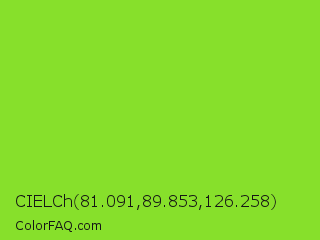 CIELCh 81.091,89.853,126.258 Color is a normal green color and the nearest color is Kiwi #8ee53f. Hex code #87e02b and RGB value is rgb(135,224,43). In RGB color space, this color is composed of 53% red, 88% green, 17% blue, In CMYK color space, this color is composed of 40% cyan, 0% magenta, 81% yellow , 12% black , In HSL color space, this color has a hue angle of 90° , 74% saturation and 52% lightness.