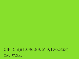 CIELCh 81.096,89.619,126.333 Color is a normal green color and the nearest color is Kiwi #8ee53f. Hex code #87e02c and RGB value is rgb(135,224,44). In RGB color space, this color is composed of 53% red, 88% green, 17% blue, In CMYK color space, this color is composed of 40% cyan, 0% magenta, 80% yellow , 12% black , In HSL color space, this color has a hue angle of 90° , 74% saturation and 53% lightness.