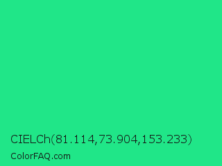 CIELCh 81.114,73.904,153.233 Color is a normal green color and the nearest color is Shamrock #33cc99. Hex code #20e688 and RGB value is rgb(32,230,136). In RGB color space, this color is composed of 13% red, 90% green, 53% blue, In CMYK color space, this color is composed of 86% cyan, 0% magenta, 41% yellow , 10% black , In HSL color space, this color has a hue angle of 152° , 80% saturation and 51% lightness.