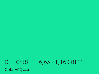 CIELCh 81.116,65.41,160.811 Color is a normal green color and the nearest color is Medium Spring Green #00fa9a. Hex code #13e59f and RGB value is rgb(19,229,159). In RGB color space, this color is composed of 7% red, 90% green, 62% blue, In CMYK color space, this color is composed of 92% cyan, 0% magenta, 31% yellow , 10% black , In HSL color space, this color has a hue angle of 160° , 85% saturation and 49% lightness.