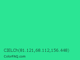 CIELCh 81.121,68.112,156.448 Color is a normal green color and the nearest color is Shamrock #33cc99. Hex code #2be594 and RGB value is rgb(43,229,148). In RGB color space, this color is composed of 17% red, 90% green, 58% blue, In CMYK color space, this color is composed of 81% cyan, 0% magenta, 35% yellow , 10% black , In HSL color space, this color has a hue angle of 154° , 78% saturation and 53% lightness.