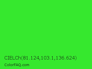 CIELCh 81.124,103.1,136.624 Color is a normal green color and the nearest color is Lime Green #32cd32. Hex code #36e82e and RGB value is rgb(54,232,46). In RGB color space, this color is composed of 21% red, 91% green, 18% blue, In CMYK color space, this color is composed of 77% cyan, 0% magenta, 80% yellow , 9% black , In HSL color space, this color has a hue angle of 117° , 80% saturation and 55% lightness.