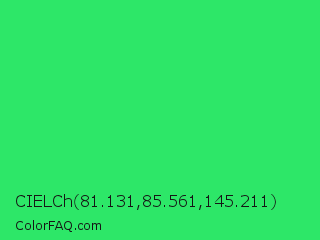 CIELCh 81.131,85.561,145.211 Color is a normal green color and the nearest color is UFO Green #3cd070. Hex code #2de768 and RGB value is rgb(45,231,104). In RGB color space, this color is composed of 18% red, 91% green, 41% blue, In CMYK color space, this color is composed of 81% cyan, 0% magenta, 55% yellow , 9% black , In HSL color space, this color has a hue angle of 139° , 79% saturation and 54% lightness.