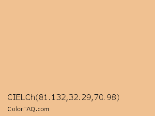 CIELCh 81.132,32.29,70.98 Color is a light orange color and the nearest color is Manhattan #f5c999. Hex code #f0c191 and RGB value is rgb(240,193,145). In RGB color space, this color is composed of 94% red, 76% green, 57% blue, In CMYK color space, this color is composed of 0% cyan, 20% magenta, 40% yellow , 6% black , In HSL color space, this color has a hue angle of 30° , 76% saturation and 75% lightness.