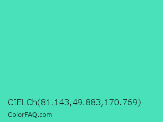 CIELCh 81.143,49.883,170.769 Color is a normal cyan color and the nearest color is Eucalyptus #44d7a8. Hex code #48e1b9 and RGB value is rgb(72,225,185). In RGB color space, this color is composed of 28% red, 88% green, 73% blue, In CMYK color space, this color is composed of 68% cyan, 0% magenta, 18% yellow , 12% black , In HSL color space, this color has a hue angle of 164° , 72% saturation and 58% lightness.