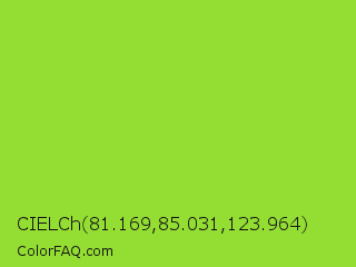 CIELCh 81.169,85.031,123.964 Color is a normal green color and the nearest color is Kiwi #8ee53f. Hex code #94de33 and RGB value is rgb(148,222,51). In RGB color space, this color is composed of 58% red, 87% green, 20% blue, In CMYK color space, this color is composed of 33% cyan, 0% magenta, 77% yellow , 13% black , In HSL color space, this color has a hue angle of 86° , 72% saturation and 54% lightness.