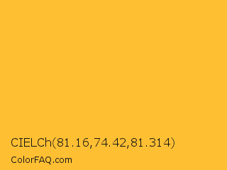 CIELCh 81.16,74.42,81.314 Color is a normal orange color and the nearest color is Saffron #f4c430. Hex code #ffbf33 and RGB value is rgb(255,191,51). In RGB color space, this color is composed of 100% red, 75% green, 20% blue, In CMYK color space, this color is composed of 0% cyan, 25% magenta, 80% yellow , 0% black , In HSL color space, this color has a hue angle of 41° , 100% saturation and 60% lightness.