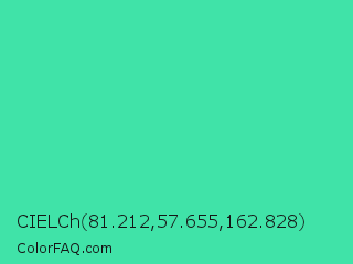 CIELCh 81.212,57.655,162.828 Color is a normal green color and the nearest color is Eucalyptus #44d7a8. Hex code #40e3a8 and RGB value is rgb(64,227,168). In RGB color space, this color is composed of 25% red, 89% green, 66% blue, In CMYK color space, this color is composed of 72% cyan, 0% magenta, 26% yellow , 11% black , In HSL color space, this color has a hue angle of 158° , 74% saturation and 57% lightness.