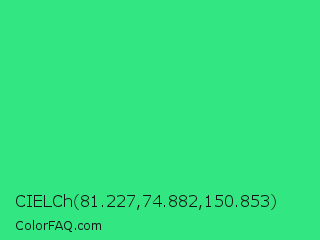 CIELCh 81.227,74.882,150.853 Color is a normal green color and the nearest color is UFO Green #3cd070. Hex code #32e682 and RGB value is rgb(50,230,130). In RGB color space, this color is composed of 20% red, 90% green, 51% blue, In CMYK color space, this color is composed of 78% cyan, 0% magenta, 43% yellow , 10% black , In HSL color space, this color has a hue angle of 147° , 78% saturation and 55% lightness.