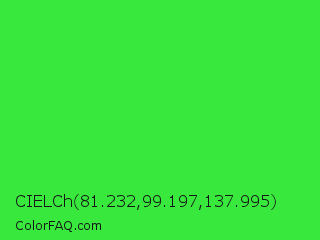 CIELCh 81.232,99.197,137.995 Color is a normal green color and the nearest color is Lime Green #32cd32. Hex code #38e83d and RGB value is rgb(56,232,61). In RGB color space, this color is composed of 22% red, 91% green, 24% blue, In CMYK color space, this color is composed of 76% cyan, 0% magenta, 74% yellow , 9% black , In HSL color space, this color has a hue angle of 122° , 79% saturation and 56% lightness.