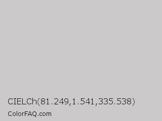 CIELCh 81.249,1.541,335.538 Color is a light magenta color and the nearest color is Pastel Gray #cfcfc4. Hex code #ccc9cb and RGB value is rgb(204,201,203). In RGB color space, this color is composed of 80% red, 79% green, 80% blue, In CMYK color space, this color is composed of 0% cyan, 1% magenta, 0% yellow , 20% black , In HSL color space, this color has a hue angle of 320° , 3% saturation and 79% lightness.