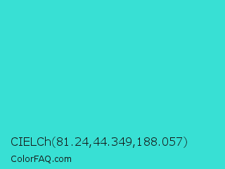 CIELCh 81.24,44.349,188.057 Color is a normal cyan color and the nearest color is Turquoise #40e0d0. Hex code #38e0d4 and RGB value is rgb(56,224,212). In RGB color space, this color is composed of 22% red, 88% green, 83% blue, In CMYK color space, this color is composed of 75% cyan, 0% magenta, 5% yellow , 12% black , In HSL color space, this color has a hue angle of 176° , 73% saturation and 55% lightness.
