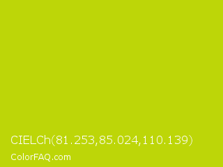 CIELCh 81.253,85.024,110.139 Color is a normal yellow color and the nearest color is Rio Grande #bbd009. Hex code #bdd608 and RGB value is rgb(189,214,8). In RGB color space, this color is composed of 74% red, 84% green, 3% blue, In CMYK color space, this color is composed of 12% cyan, 0% magenta, 96% yellow , 16% black , In HSL color space, this color has a hue angle of 67° , 93% saturation and 44% lightness.