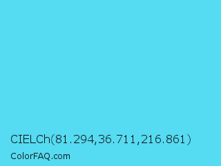 CIELCh 81.294,36.711,216.861 Color is a light cyan color and the nearest color is Turquoise Blue #6cdae7. Hex code #55dbf2 and RGB value is rgb(85,219,242). In RGB color space, this color is composed of 33% red, 86% green, 95% blue, In CMYK color space, this color is composed of 65% cyan, 10% magenta, 0% yellow , 5% black , In HSL color space, this color has a hue angle of 189° , 86% saturation and 64% lightness.