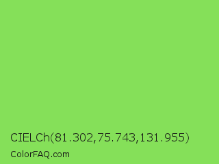 CIELCh 81.302,75.743,131.955 Color is a light green color and the nearest color is Kiwi #8ee53f. Hex code #85e059 and RGB value is rgb(133,224,89). In RGB color space, this color is composed of 52% red, 88% green, 35% blue, In CMYK color space, this color is composed of 41% cyan, 0% magenta, 60% yellow , 12% black , In HSL color space, this color has a hue angle of 100° , 69% saturation and 61% lightness.