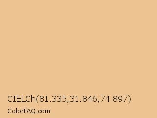 CIELCh 81.335,31.846,74.897 Color is a light orange color and the nearest color is Gold Sand #e6be8a. Hex code #edc391 and RGB value is rgb(237,195,145). In RGB color space, this color is composed of 93% red, 76% green, 57% blue, In CMYK color space, this color is composed of 0% cyan, 18% magenta, 39% yellow , 7% black , In HSL color space, this color has a hue angle of 33° , 72% saturation and 75% lightness.