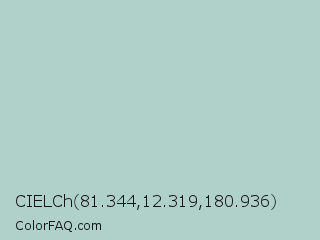 CIELCh 81.344,12.319,180.936 Color is a light cyan color and the nearest color is Jet Stream #b5d2ce. Hex code #b0d1ca and RGB value is rgb(176,209,202). In RGB color space, this color is composed of 69% red, 82% green, 79% blue, In CMYK color space, this color is composed of 16% cyan, 0% magenta, 3% yellow , 18% black , In HSL color space, this color has a hue angle of 167° , 26% saturation and 75% lightness.