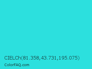 CIELCh 81.358,43.731,195.075 Color is a normal cyan color and the nearest color is Turquoise #40e0d0. Hex code #2ce0de and RGB value is rgb(44,224,222). In RGB color space, this color is composed of 17% red, 88% green, 87% blue, In CMYK color space, this color is composed of 80% cyan, 0% magenta, 1% yellow , 12% black , In HSL color space, this color has a hue angle of 179° , 74% saturation and 53% lightness.