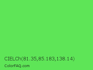 CIELCh 81.35,85.183,138.14 Color is a light green color and the nearest color is Screamin Green #66ff66. Hex code #5ee557 and RGB value is rgb(94,229,87). In RGB color space, this color is composed of 37% red, 90% green, 34% blue, In CMYK color space, this color is composed of 59% cyan, 0% magenta, 62% yellow , 10% black , In HSL color space, this color has a hue angle of 117° , 73% saturation and 62% lightness.