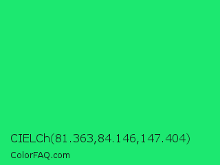 CIELCh 81.363,84.146,147.404 Color is a normal green color and the nearest color is Malachite #0bda51. Hex code #1ce870 and RGB value is rgb(28,232,112). In RGB color space, this color is composed of 11% red, 91% green, 44% blue, In CMYK color space, this color is composed of 88% cyan, 0% magenta, 52% yellow , 9% black , In HSL color space, this color has a hue angle of 145° , 82% saturation and 51% lightness.